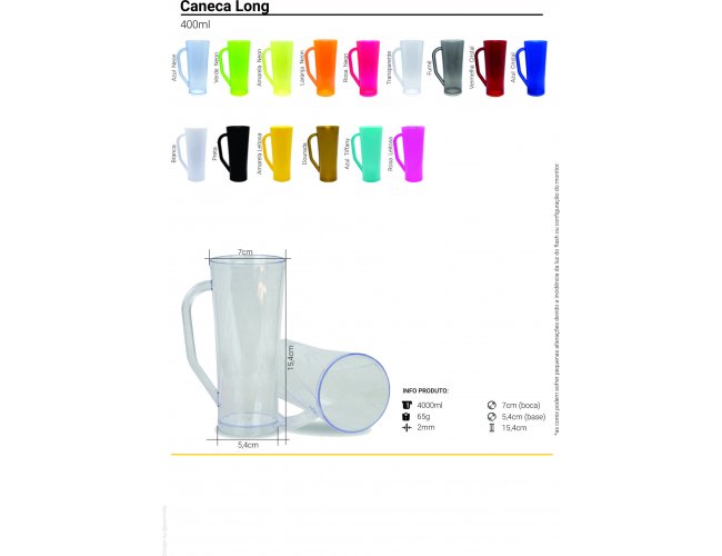 - Cor: Azul Neon, Verde Neon, Amarelo Neon, Laranja Neon, Rosa Neon, Transparente, Fumê, Vermelha Cristal, Azul Cristal, Branca, Preta, Amarela Leitosa, Dourada, Azul Tiffany, Rosa Leitosa