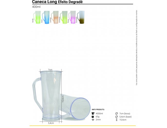 - Cor: Verde Degradê, Azul Degradê, Laranja Degradê, Amarelo Degradê, Rosa Degradê, Dourado Degradê, Preto Degradê
