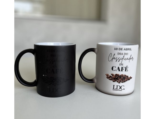 - A personalização é realizada de forma artesanal e possui um processo de sublimação. A caneca fica preta quando está fria, e ao ser colocado um líquido quente, ela vai gradativamente mostrando a arte escolhida.