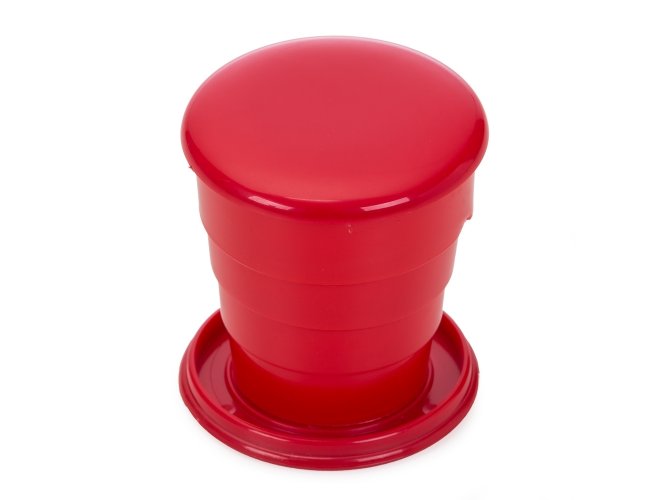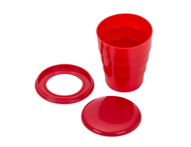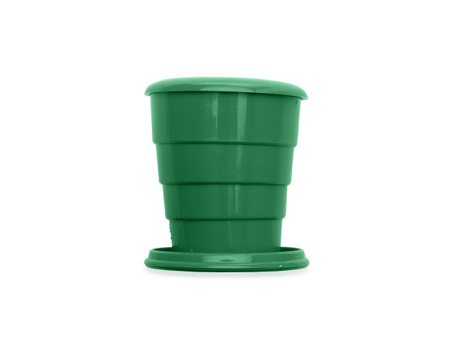 Copo retrátil 130ml de plástico com tampa. Basta puxar para cima para "armar" o copo, pode ser inteiramente desmontado.