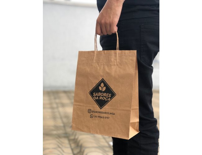 - A personalização é realizada de forma artesanal e é realizado um processo de silk com uma tinta especifica para sacolas kraft, fazendo com que a arte fixe direto na peça.