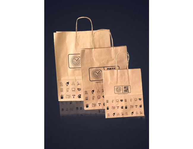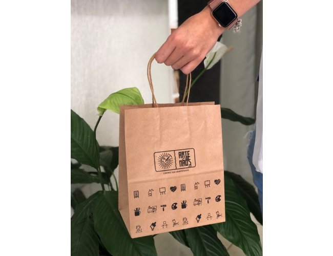 - A personalização é realizada de forma artesanal e é realizado um processo de silk com uma tinta especifica para sacolas kraft, fazendo com que a arte fixe direto na peça.